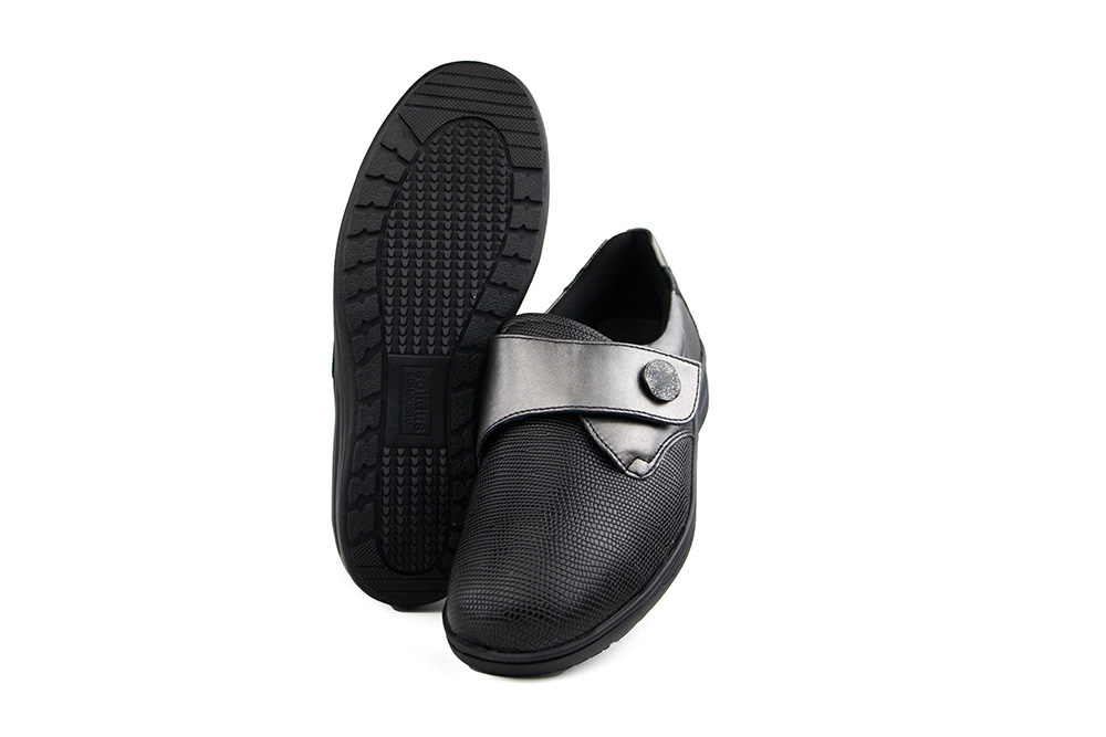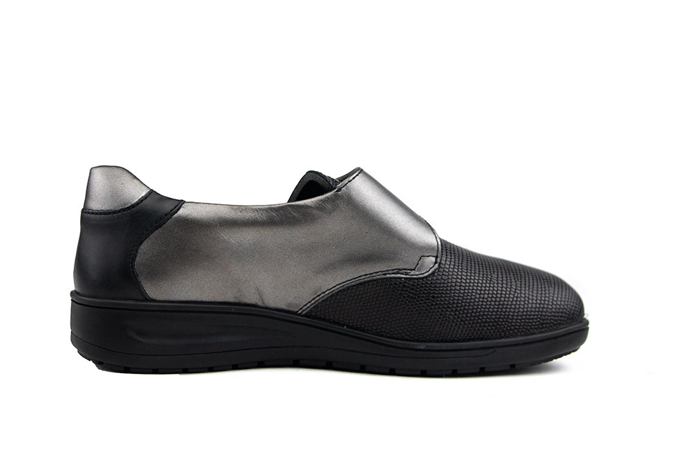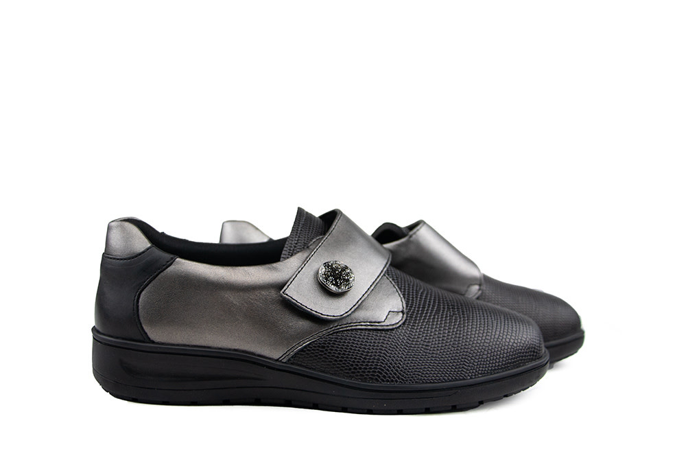 The Solidus Kate Louvre shoes offer the perfect mix of comfort and style. Featuring different shades of grey with a subtle print and a metallic finish, they bring a refined, modern look to any outfit. The decorative button on the Velcro strap adds a charming detail.