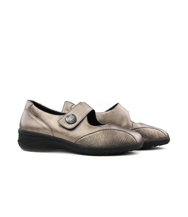 Bronze leather Solidus strap shoes for stylish ladies. They have a lizard print on the sides of the instep, a beautiful decorative button on the strap, and subtle stitching lines. The refined fit and sturdy lightweight sole make the strap shoes super comfortable on your feet. The Velcro strap makes them easy to put on and take off. The whole look is stylish, chic, and easy to match.