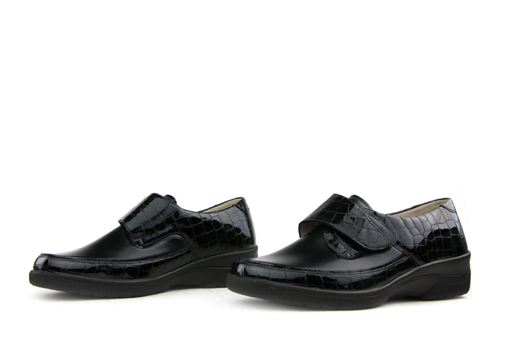 Black leather Solidus velcro shoes for stylish ladies. They have a plain leather instep and tongue and a patent leather croco print over the rest of the shoes. The soft materials, fine fit, and lightweight sole make them super comfortable on the feet. The velcro closure makes putting them on and off super easy. The black and croco print makes them stylish, timeless, and chic.