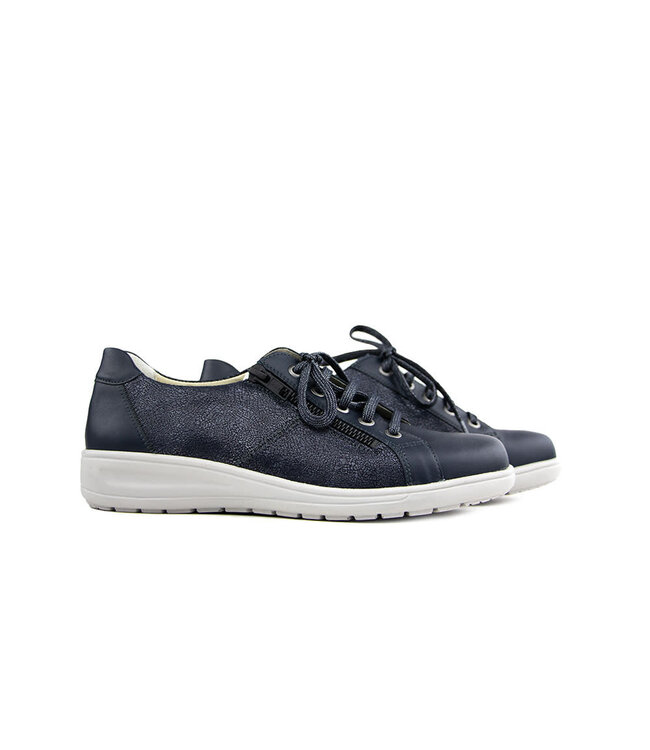 These are stylish Solidus lace-up shoes for ladies with slightly wider feet. They come in a beautiful blue leather color with a metallic finish, a print on the side, and subtle glitter incorporated into the laces. The shoes are designed with H width, padded lining, and lightweight sole to provide a comfortable fit. You can also wear orthotics in the shoes as the removable footbed allows you to do so. Additionally, the shoes have a side zipper for easy donning. They are comfortable, stylish, and great for spring.