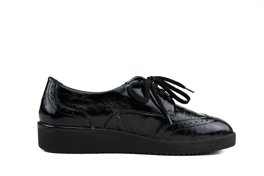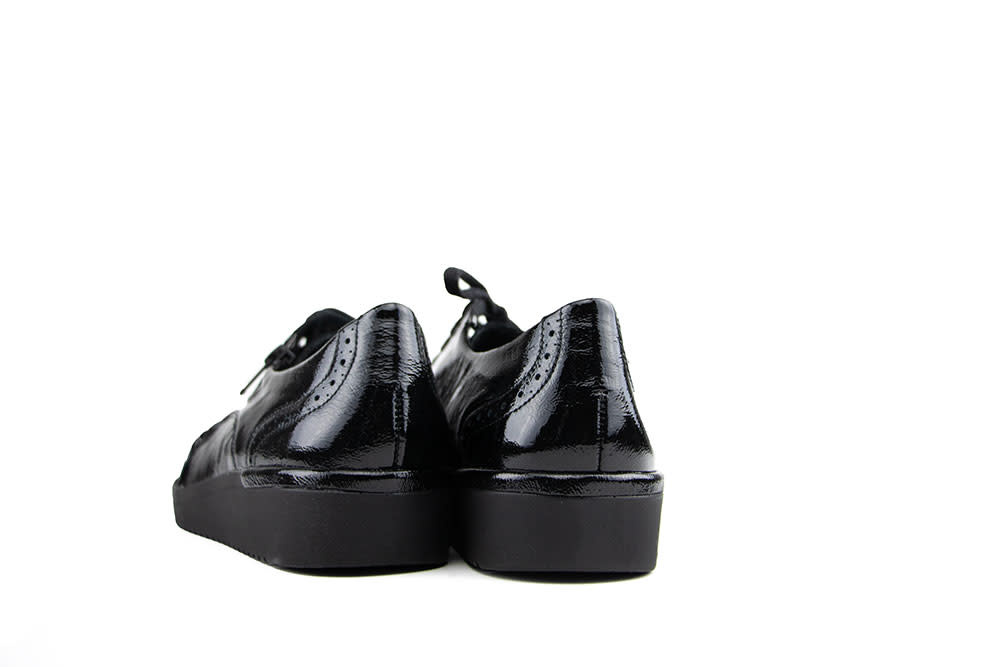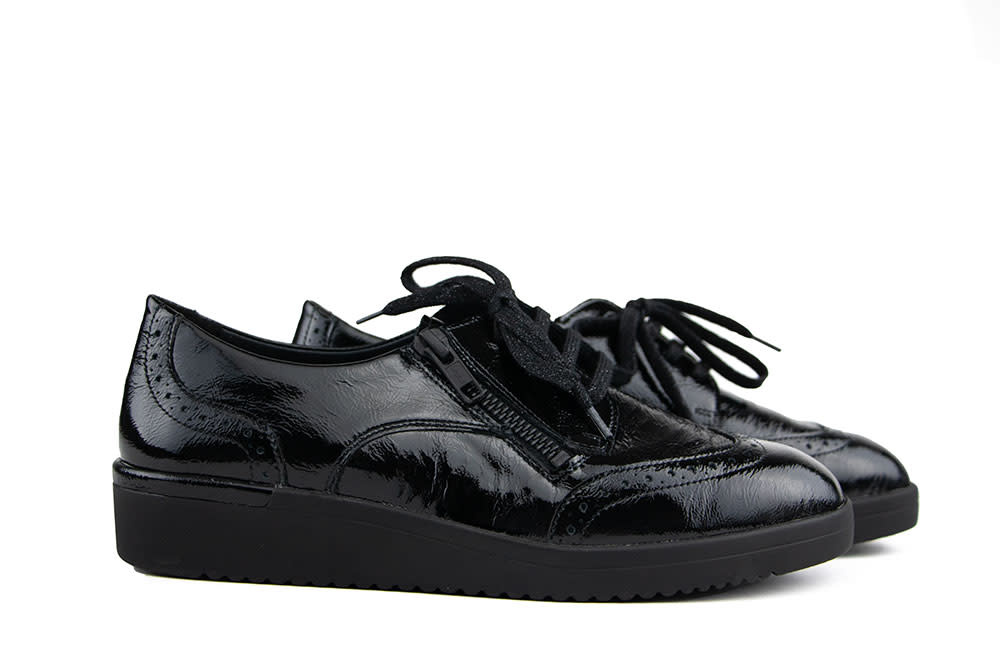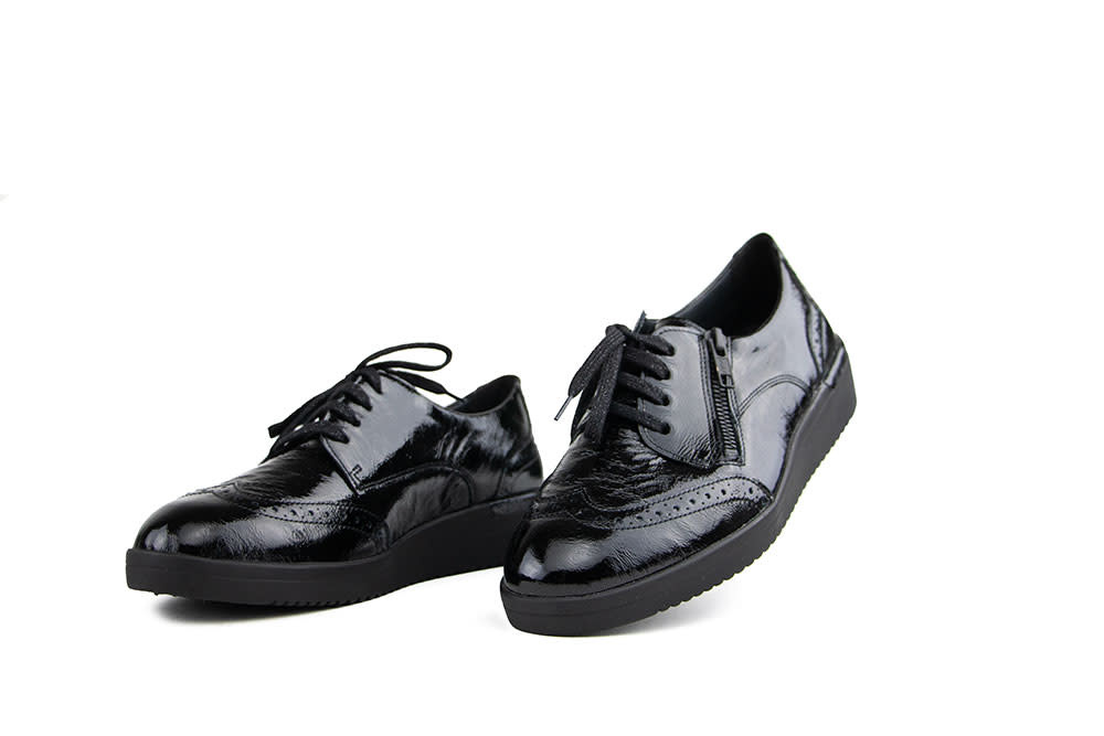 Shiny black leather Solidus women's lace-up shoes for fall. The shoes have a patent finish, a brogue motif and a glitter finish in the laces. You slip the shoes on easily with the zipper on the side. On the feet they are great because of the soft materials, lightweight sole and super fit. Extra nice are the K width and the removable footbed. With these lace-up shoes on your feet, you will be prepared for any situation.