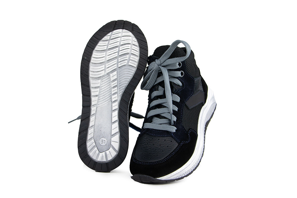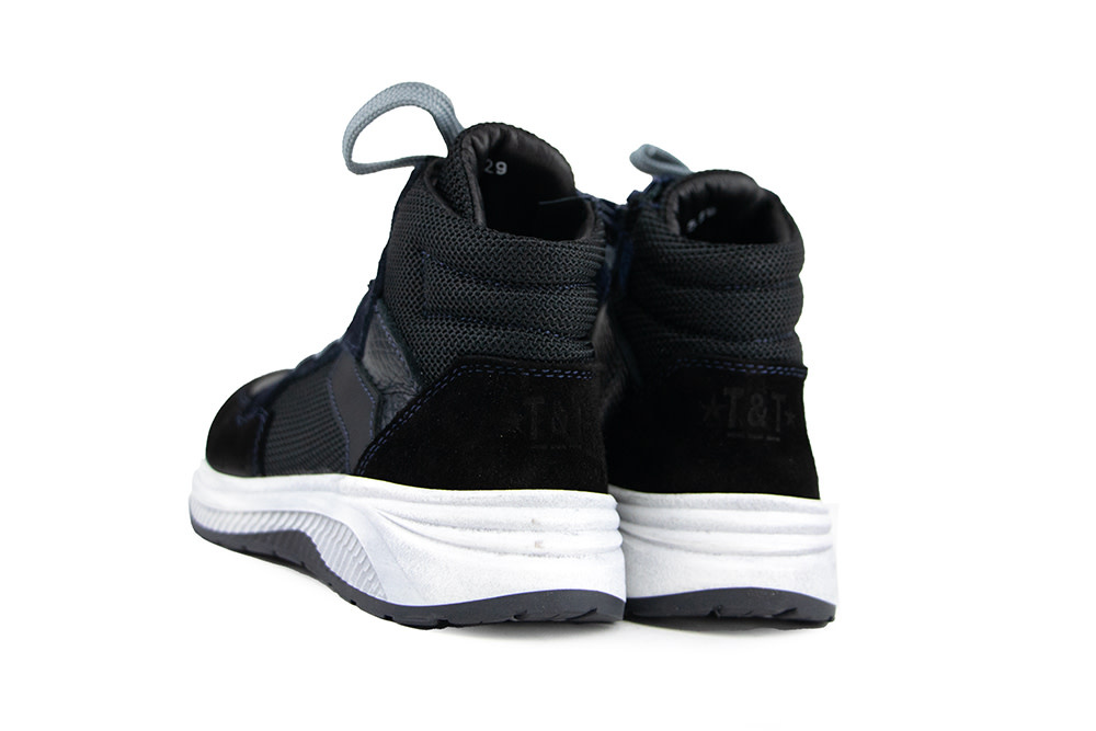 These high-top sneakers by Trackstyle are made from a mix of dark blue leather, suede and textile. The perforated instep, light-colored laces and material contrast give them a sporty, modern look. The rugged dirt-look sole adds a cool finishing touch.