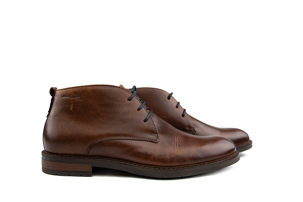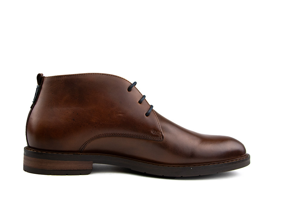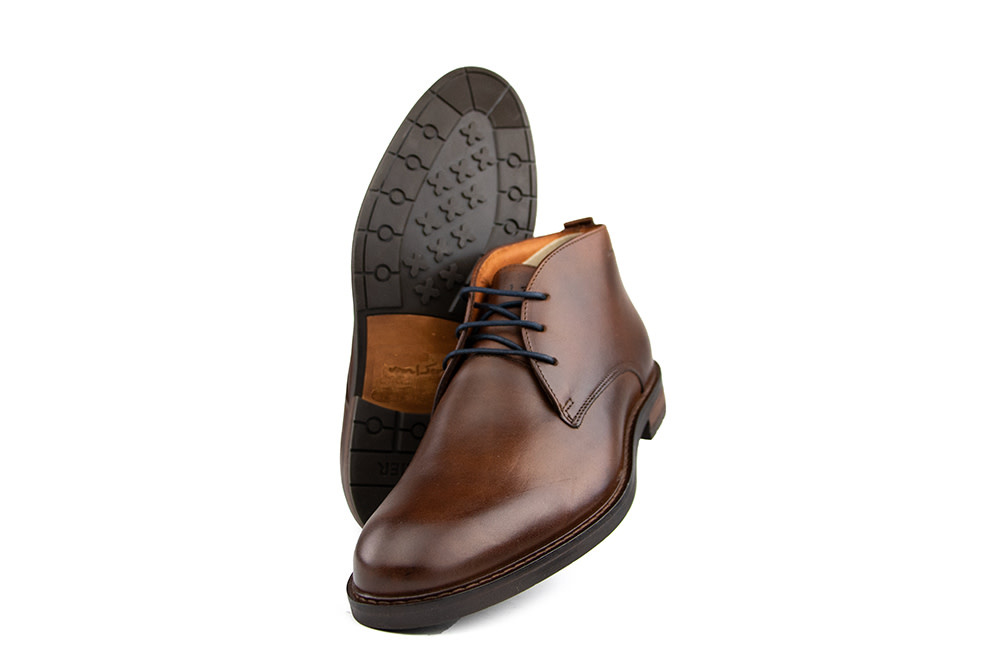These Van Lier Boston high lace-up shoes are a stylish choice for men who appreciate classic design with a modern twist. Made from rich cognac brown leather, they feature a subtle heel print, a blue rubber accent on the back, and matching blue laces for a refined yet contemporary look. The fine stitching and wood-look heel add a touch of craftsmanship, while the leather lining ensures comfort all day long. Perfect for men who value both sophistication and practicality – whether at work or during off-hours.