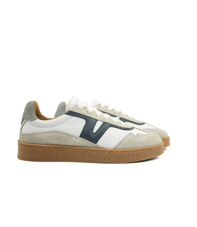 These Via Vai men’s sneakers offer a clean, modern look with subtle character. Crafted from white leather combined with gray suede, the upper creates a fresh and well-balanced appearance. A dark blue accent adds depth and gives the sneaker a refined, contemporary touch.